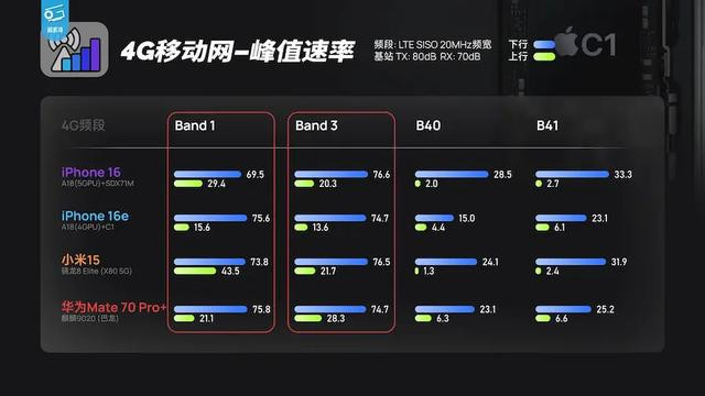 要是在使用 TDD-LTE B40、B41 频段下, 苹果C1芯片就出现明显下载速度比高通芯片慢,反而上传速度又优于高通情况,明显来看,不管是 C1 芯片在针对频段优化和高通基频是完全不同。