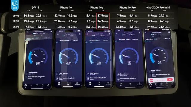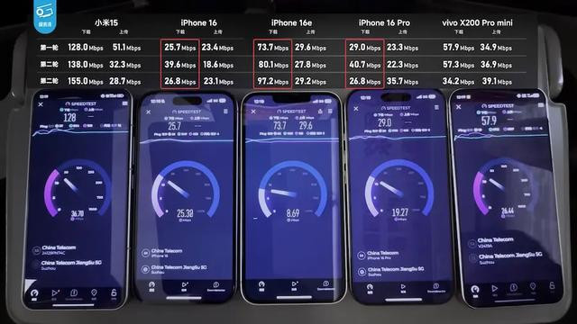 最后实测也将 iPhone 16e 和 iPhone 16 系列在高铁上进网速测试,根据 SpeedTEST 数据显示,苹果C1芯片在5G下载和上传速度明显优于高通芯片,而且差距极大。