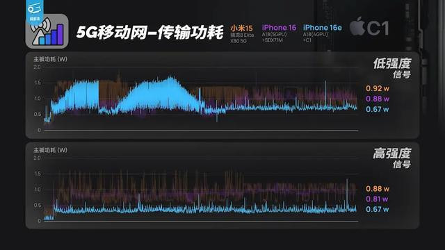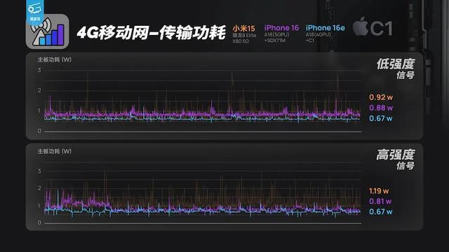 根据苹果C1和高通芯片5G功耗实测发现,C1芯片在同样的5G蜂窝网络条件下,不管是在信号强度较佳或较差的环境下使用,iPhone 16e 蜂窝网路功耗明显比搭载高通的iPhone 16和小米15的X80芯片都要来得低,从数据显示 C1 功耗比起高通降低约 17%~20% 左右。