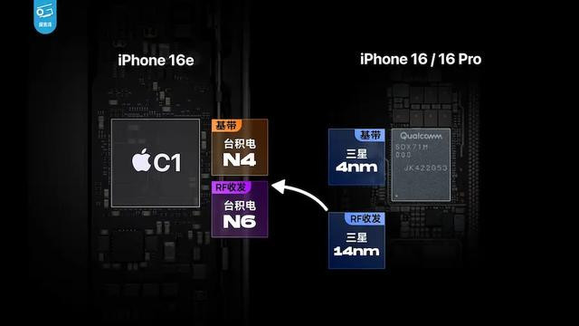 首先在 iPhone 16e 搭载的 Apple C1 与 iPhone 16 使用高通 SDX71M 5G芯片来看两块差异,在C1晶片内的基频芯片、RF收发全采用台积电N4和N6制程来组成,相对在 iPhone 16 搭载的高通SDX71M芯片只是三星4奈米和较旧的14奈米RF收发机。