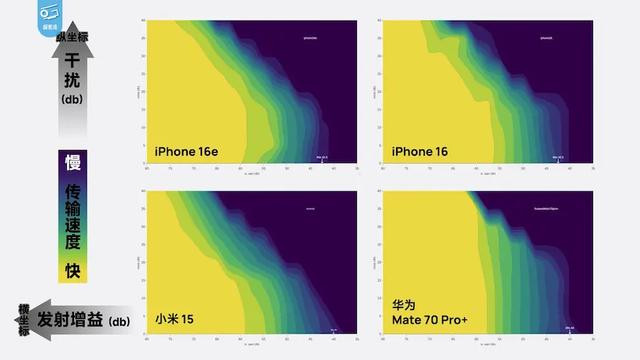 在干扰环境下,从 iPerf 拉流下行测速来判断信号品质,在同样 5G 环境下,不管是 iPhone 16e 或 iPhone 16 信号表现都相当接近,但在干扰比较低的状态下,高通芯片掉速相对比 C1 芯片更早下滑,同样初期都会跑到 70多dB的增益,就会开始明显掉速,如拿小米和华为手机一起来比较,小米芯片更差反而华为抗干扰状态更有优势。