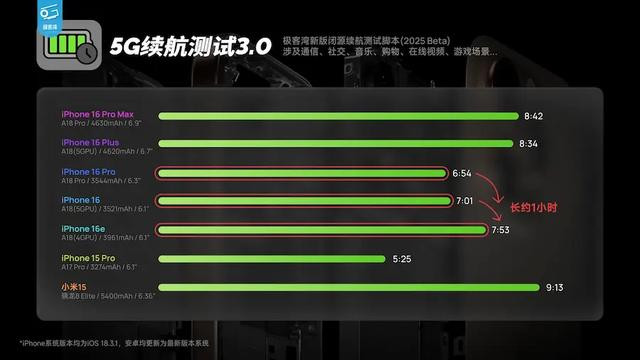 两款芯片在续航力表现实测下,能明显看出 Apple C1 蜂窝网路续航直接超越高通芯片,要是以 iPhone 16 Pro 高通来比较,同样在 5G 网络环境下直接多出 1小时续航力,要是和 iPhone 15 Pro 来比较,C1 芯片续航更是达到 2.5 小时优势。